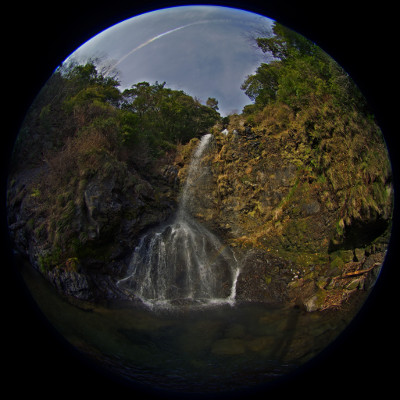 滝の下にかかった虹を撮っていて、ふとなにげなく上を見たらビックリ。飛行機雲が虹色に輝いていました。環天頂アークとかっていうやつが部分的に現れているのでしょうか?