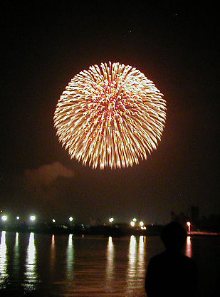 ちなみに、花火の左下付近にコメットハンターの関勉さん宅があります。自宅屋上から花火が見られてうらやましいですが、関さんは「騒がしいのであまり......。」とのことです。関さん宅から見た迫力の花火の様子はコメットハンター関勉のホームページの星日記に掲載されていますのでご覧ください。 |
