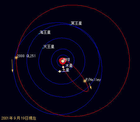 | 2001年9月16日(日曜日) 晴れ 【小惑星とニアミスだ!?】 13日に軌道図を掲載したまま本文を書くのを忘れていました。ええと、何を書きたかったのか忘れてしまいましたが....。 軌道図は9月11日にローウェル天文台が発見した小惑星 2001 RU17 の9月14日現在の位置を示したものです。 |