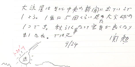 | 2002年9月24日(火曜日) 晴れ 【かなり涼しい一日】 関勉氏のホームページの星雑草(きまぐれ日記)9月23日分によると、当日芸西天文台(高知県)の一般公開中にすっごい流れ星(大火球)があったそうです。どんなにすごかったかと言うと、下の絵のとおりのようです。流星関係のウェッブページにある掲示板ではもうすでに話題になっているかもしれません。これからチェックしてみます。 |